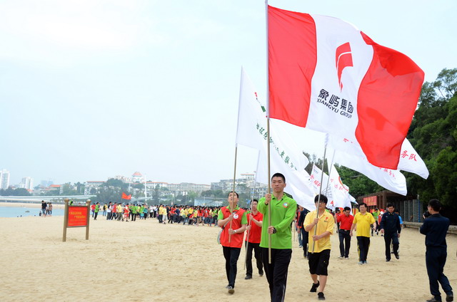 活動啟動儀式上,集團(tuán)公司黨委副書記、工會主席陳偉彬代表集團(tuán)領(lǐng)導(dǎo)班子向共建單位代表及全體員工致以節(jié)日的問候!陳副書記表示,我們要尊重勞動、謳歌勞動者;我們要倡導(dǎo)運(yùn)動,褒獎優(yōu)勝者;我們崇尚遠(yuǎn)大的理想,憧憬美好的未來。海軍南方局李躍峰副政委對象嶼集團(tuán)在勇?lián)鐣?zé)任、傳承愛心善行方面所作的努力高度贊揚(yáng),并表示這對深入培育當(dāng)代革命軍人核心價值觀方面具有十分積極的推動促進(jìn)作用。隨后進(jìn)行了“象嶼集團(tuán)縱走俱樂部”授旗儀式,集團(tuán)總裁張水利為縱走俱樂部授旗,號召更多縱走愛好者“走在一起,樂在一起”!集團(tuán)及海軍南方局領(lǐng)導(dǎo)、十佳員工及志愿者代表鳴槍發(fā)令,全體人員在司旗的帶領(lǐng)下,向著音樂廣場出發(fā)了!