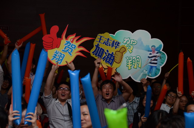 在激揚的歌曲聯(lián)唱《五月的花?!分校璩荣愓介_始。16名選手按組別輪流登場,現(xiàn)場精彩萬分。歌聲或激蕩高昂,或宛轉(zhuǎn)悠揚,或徐徐如風,或渾厚有力;表現(xiàn)力或動感十足,或動靜相宜,或幽靜宜人;曲風各異,或熱辣奔放,或溫暖抒情,或自然歡快,或懷舊悠揚。啦啦隊陣容也不容小覷,加油牌、口哨、熒光棒一應俱全,或歌唱伊始吶喊助威,或伴隨著歌聲興奮地揮舞著手臂,更有甚者激動地走到臺上為選手喝彩,臺上臺下照相印襯、融為一體。期間,軍企拉歌、擊鼓傳花等活動環(huán)節(jié)也將比賽推向一個又一個高潮。